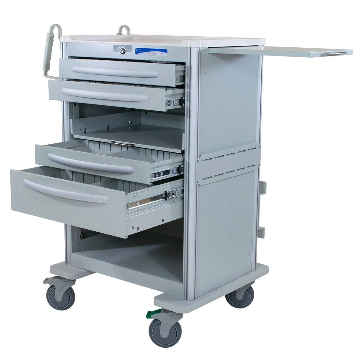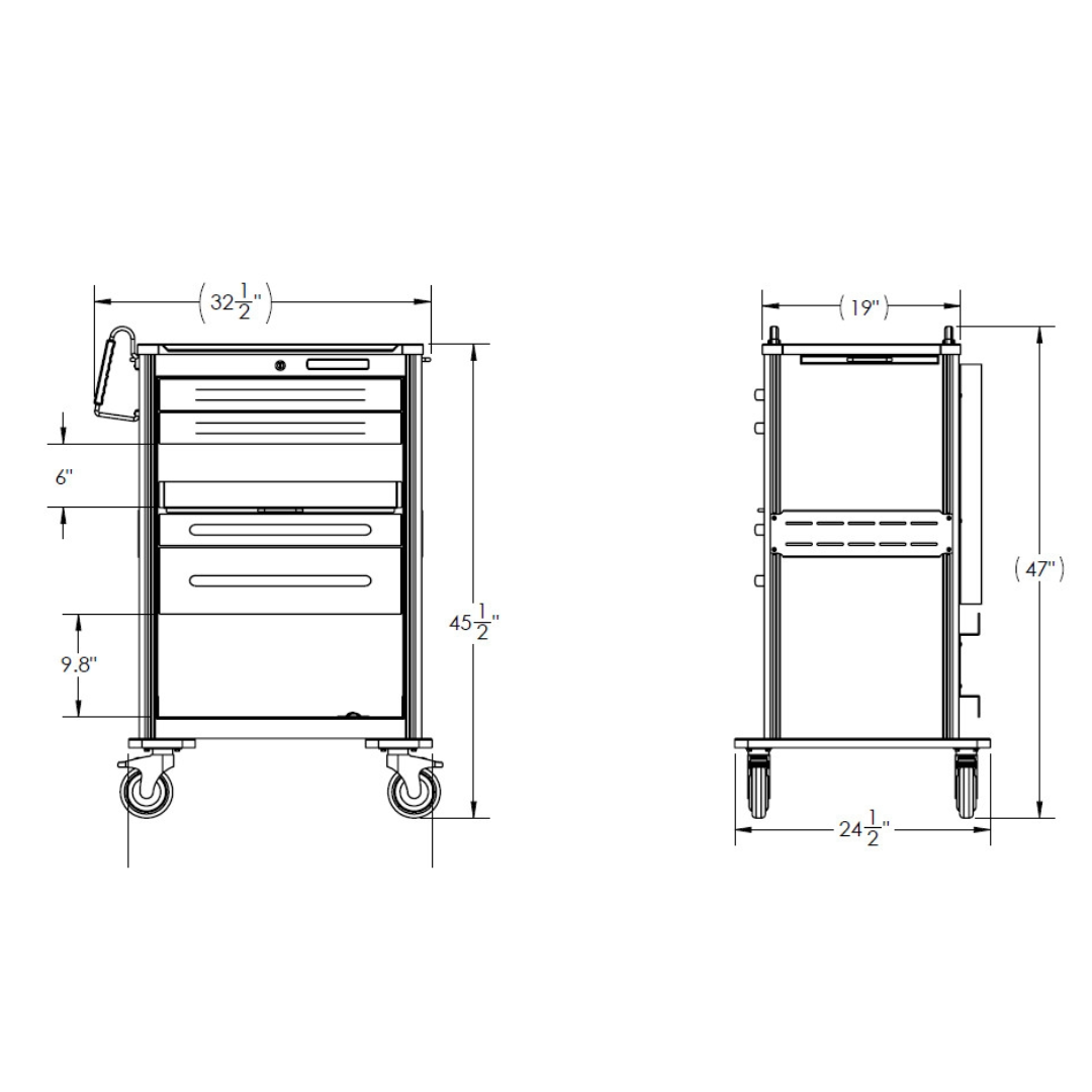 The Surgical Device Cart is constructed with a lightweight aluminum body and all the features you need: aseptic surfaces for easy cleaning, sectioned drawers for intuitive organization, and a sleek, contemporary appearance. Standard Features: A removable plastic top designed for easy cleaning, in addition to dual slide-out surfaces for added work space. 5” easy-rolling wheels for smooth transit from patient to patient. Wheels lock for stability. Durable, scratch-resistant, nylon-reinforced polycarbonate bumper protects the cart’s wheels and exterior from wear and tear over time. Auto-closing, ball-bearing drawers. Features three 3” drawers and one 6” drawer with additional room for equipment. Dimensions: 29” x 24.5” x 45”