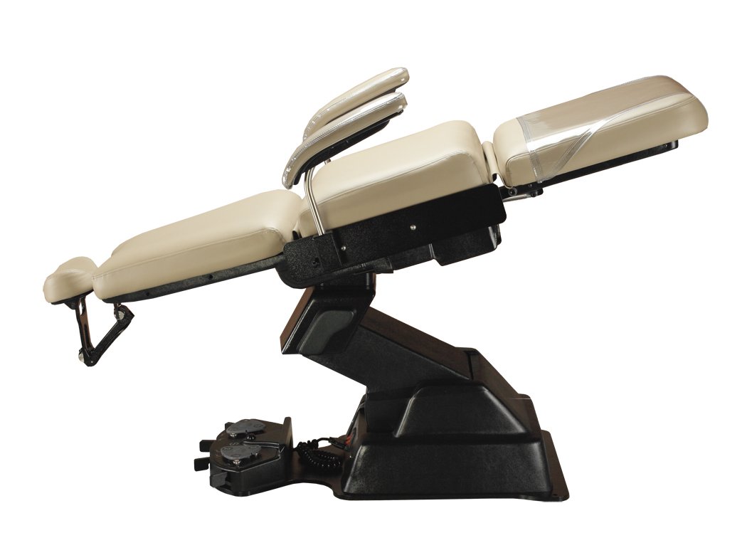 Standard Features: Ergonomic tapered style back 4 DC electric Motors operated by Programmable Foot Control Two-piece seat with independent control of toe section Cantilevered style lift base with 14" of vertical travel Independent powered seat tilt for trendelenburg positioning Flat table positioning Detachable Foot Control Three (3) programmable settings Automatic "Return to Home" Emergency power lock-out switch Pair of Swing-out Locking patient arms Choice of Dual Articulating Headrest Durable all steel frame Internal 115vAC Medical Grade Duplex Receptable Snap-on/Snap-off upholstery Foot protector Options: Upholstery Color and Style Base Color - Putty or Black Patient Prone Arms